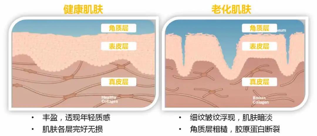 随着年龄增长,肌肤自我修复能力不足以应对皮肤损伤积聚速度,导致皮肤出现老化迹象。从上图我们可以看出:
