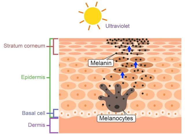 这些黑色素,通过角质细胞转移到皮肤表面,肤色看起来就变黑了。
