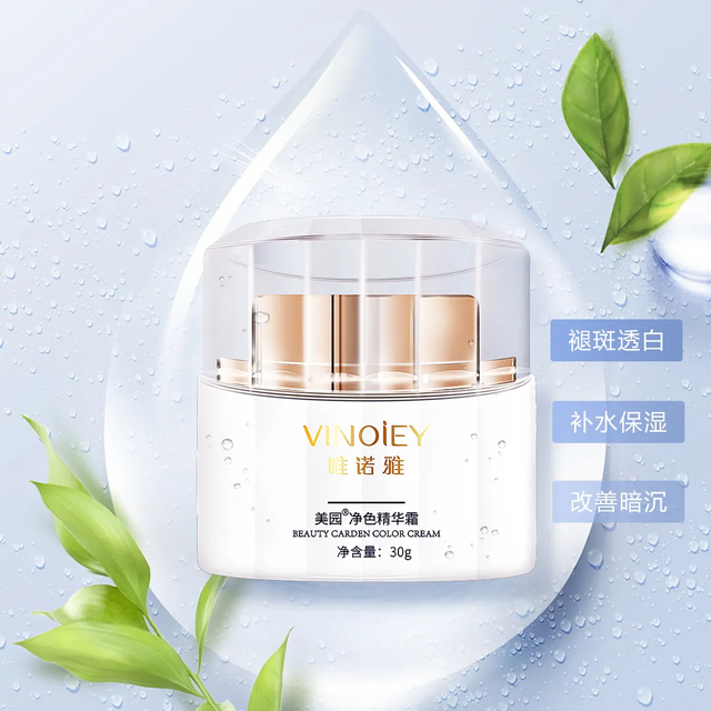 唯诺雅这款美园净色精华霜,含有丰富的祛斑精华,有效控制多余黑色素的数量可强效对抗黑色素产生,降低肌肤中黑色素和有色细胞的含量,从根源上杜绝色斑的形成与复发。